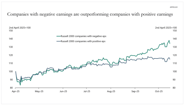 Something remarkable is going on in the equity market. Stock prices of companies with negative earnings have in recent months outperformed stock prices of companies with positive earnings, see chart below.
